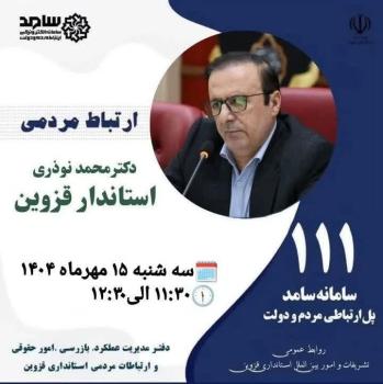از ساعت: ۱۱:۳۰ الی ۱۲:۳۰ با حضور در مرکز سامد(شماره تماس ۱۱۱) با مردم شریف استان گفتگو خواهد کرد.